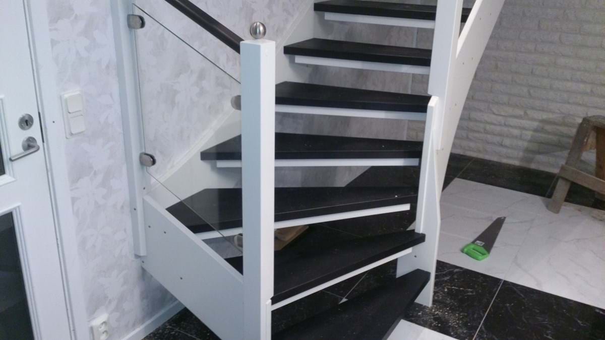 L-trappa med svartbetsade detaljer/vit med glasräcken